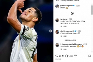 贝林厄姆在社交媒体上晒出了自己进球后的“喝酒”庆祝动作,并配文写道:“干杯🍻”。