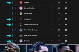 欧冠联赛阶段还剩最后一轮,积分榜前8名中英超球队占据5席!掌握直通淘汰赛主动权💪🏴