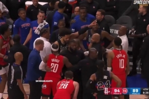 GIF-活塞和火箭冲突 坎宁安拉开霍兰后指着火箭球员说道:你们都给我退后!我可要揍你们了,别再惹我们了,笨蛋!