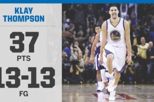 克莱在上半场不显山露水,9投3中得到13分,但在第三节突然暴走,他单节打满12分钟,13投13中,其中三分9中9,罚球2中2,单节得到37分,创NBA历史个人单节得分纪录!
