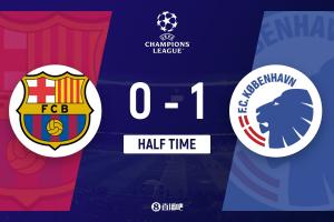 上半场补时1分钟,巴萨0-1哥本哈根。