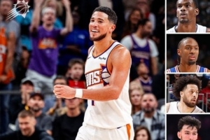 新星队的阵容是:斯科蒂·巴恩斯、布克、康宁汉姆、杜伦、爱德华兹、霍姆格伦、杰伦·约翰逊、马克西。