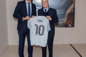 主席弗洛伦蒂诺·佩雷斯先生与邵佳一教练亲切会面并互赠球衣。邵佳一先生参观了皇马体育城,观摩了青年队训练,并与体能教练平图斯、医疗总监尼科·米希奇博士进行了专业交流。