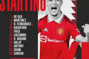 曼联首发:1-德赫亚、23-卢克肖、6-利桑德罗-马丁内斯、19-瓦拉内、20-达洛特、18-卡塞米罗、8-B费、17-弗雷德、21-安东尼、10-拉什福德、25-桑乔