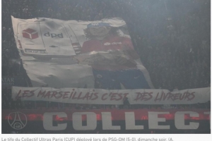 这一被篡改但具有冒犯性的巨幅横幅影响恶劣。专营包裹运输与配送业务(隶属于法国邮政集团)的DPD公司本周一发布公告,表示遗憾其“公司标识被篡改,并用于传达具有攻击性且违背其所捍卫的价值观的信息”。这是在巴黎圣日耳曼队与马赛队比赛(5比0)次日作出的明确回应。比赛中,巴黎球迷展示了一幅巨幅横幅,上面写着“DPD”和“马赛人就是送货员”。