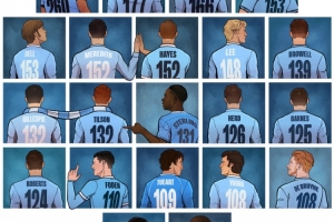 曼城官方社媒晒出了队史射手榜情况,哈兰德如今能够并列第4位,想要追赶队史射手榜榜首的阿圭罗仍需一段时间,阿根廷射手有260球入账。