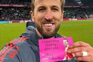 时值情人节,拜仁官推也晒出了凯恩手持爱心卡片的互动照,凯恩手持着一张印有表白的卡片:“拜仁球迷致凯恩:我们无法停止想念你!”其中,can还借用了凯恩Kane名字的谐音。