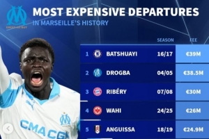 体育资讯1月15日讯 罗马已经官宣引进马赛18岁中锋瓦斯,《转会市场》也统计了马赛队史最贵转出情况,巴舒亚伊居首。