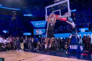 卡特·布莱恩特胯下抛球打板连续失败,最后换了一个360度普通扣篮,只得43分,无缘冠军。