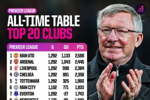 英超历史总积分排名(前20名):