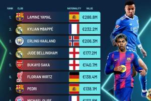 体育资讯02月19日讯 Football Benchmark今日更新了球员身价,在其最新的身价排行中,亚马尔以2.868亿欧位居榜首,姆巴佩和哈兰德也突破2亿欧。