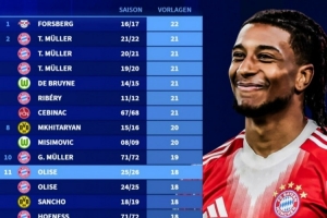 体育资讯2月21日讯 德转盘点了德甲历史单赛季助攻榜,其中本赛季奥利塞22轮过后取得18次助攻,有望打破历史纪录,具体榜单如下: