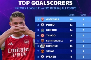 英超球员2026年各项赛事进球排名: