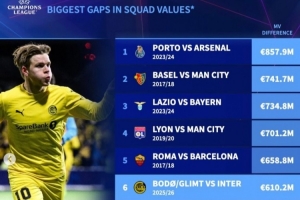 体育资讯2月25日讯 国米在本轮欧冠主场1-2不敌博德闪耀,两回合总比分2-5被双杀,德转数据统计显示,两队身价相差6.1亿欧元,这也是欧冠以弱胜强的第6大身价差。