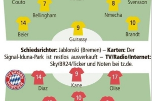 多特蒙德:科贝尔;施洛特贝克、安东、埃姆雷·詹;丹尼尔·斯文松、菲利克斯·恩梅查、乔布·贝林厄姆、扬·库托;布兰特、吉拉西、拜尔
