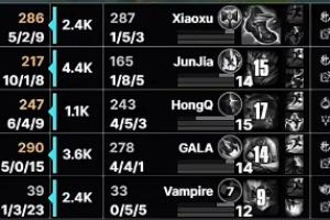 第二局比赛JDG下路Gala状态毫无起色,更是出现冒进W开团被蹲带队送3人的尴尬场面,最终全场仅拿到4-4-1的数据