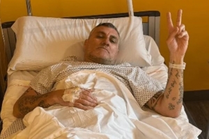 图中他穿着病号服,面带微笑,对着镜头比出胜利的"V"字手势。维埃里在照片下写道:这一关也闯过去了。