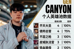 Gen.G Canyon 9个英雄,选用最多英雄为猴子和赵信(4次),胜率100%/75%