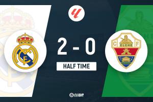 第39分钟,皇马禁区前沿获得任意球机会,巴尔韦德大力抽射,球被门将扑出,随后埃尔切球员解围没顶远,吕迪格迎球抽射打进,皇马1-0领先!↓