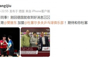 效力杜塞尔多夫的华裔选手邱党更新社媒,对樊振东即将加盟表示欢迎。邱党在社媒写道: