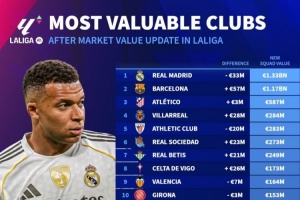 体育资讯3月22日讯 德国转会市场盘点了西甲球队的身价变化,巴萨增加5700万欧,皇马下降3300万欧。