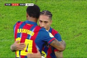 西班牙超级杯决赛,巴萨3-2击败皇马夺冠。拉什福德第83分钟换下拉菲尼亚,第95分钟时巴萨3-2领先皇马,拉什福德跑出半场大单刀,慢悠悠错失良机。转过头来皇马进攻,姆巴佩直塞禁区,居莱尔下底倒三角,卡雷拉斯点球点附近直面球门的推射被霍安没收,巴萨险些被绝平,拉什福德几乎全程眼神防守。