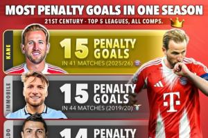 21世纪单赛季点球进球榜: