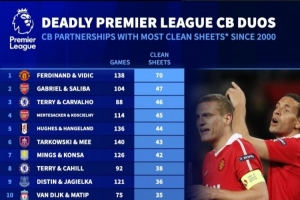 2000年以来中卫组合英超零封榜(仅统计两人联袂首发比赛)